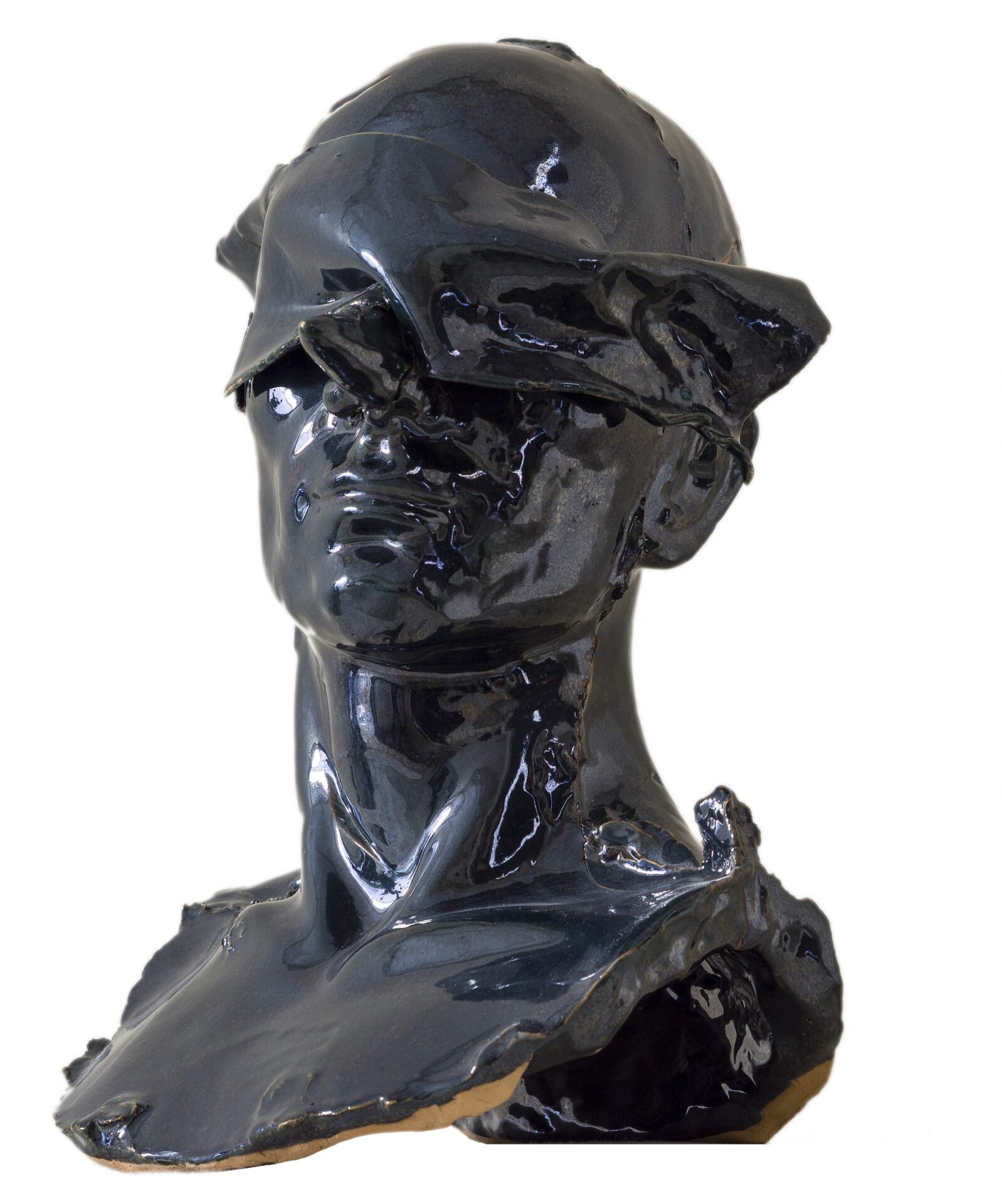 Busto in ceramica nero raffigurante il volto silenzioso di un uomo calvo a cui vengono tappate le orecchie